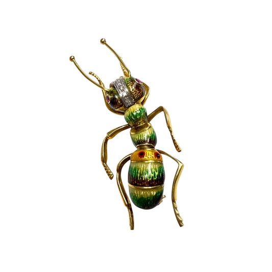 Ruby & White Diamond Ant Enamel Brooch in 18k Yellow Gold 15.1g.