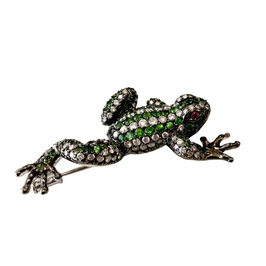 1.5 cttw. White Diamond & 1 cttw. Tsavorite Frog Brooch in 18k White Gold 16.62g