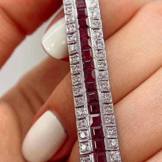 7.7cts No Heat Rubies & White Diamonds Art Deco Bracelet in 18K White Gold 30g