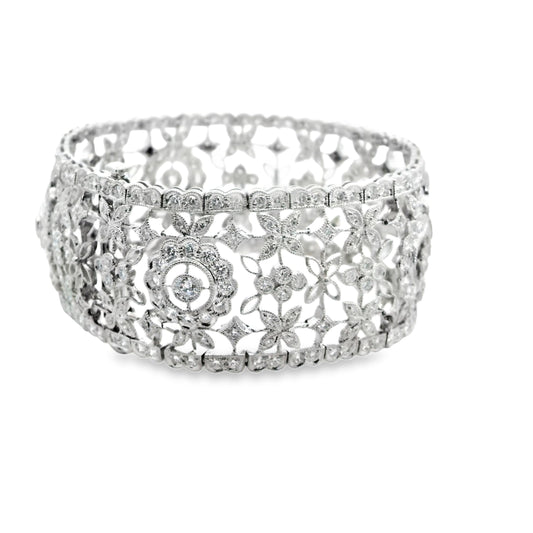 9.20cttw. White Diamond Vintage Wide Bracelet in 18k White Gold 7" 51.23g.