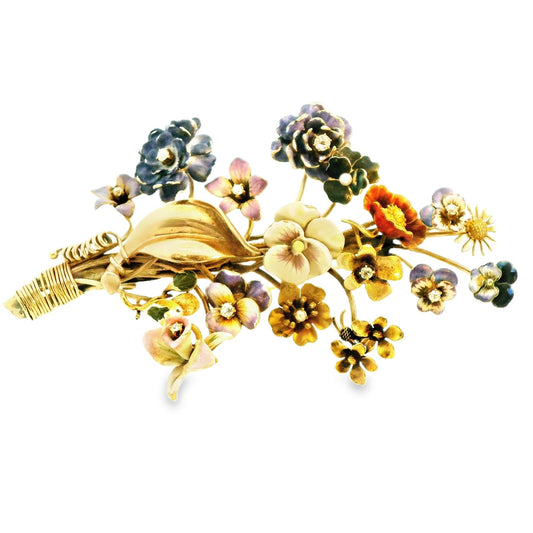 14k Yellow Gold Enamel Bouquet Brooch 30.54g.