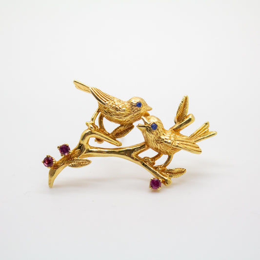 14k Yellow Gold Birds Brooch With Blue & Pink Sapphires 9.12g