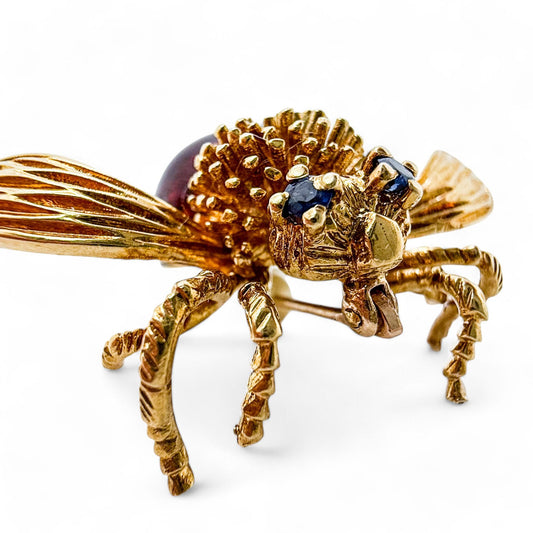 Vintage 18k Yellow Gold Bee Brooch with Blue Sapphire 14.60g