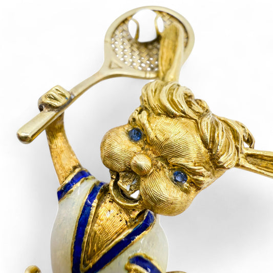 Vintage 18K Yellow Gold Martine Tennis Rabbit Brooch whith Blue Sapphires 20.8