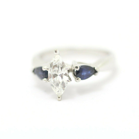 Marquise Diamond and Pearshaped Blue Sapphire Solitaire Ring in 14k White Gold