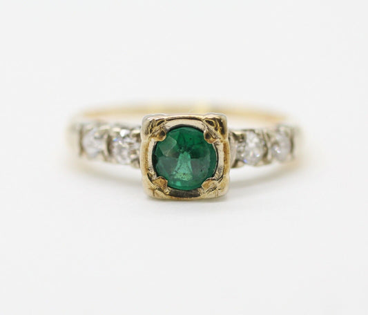 14k Two Tone Gold Emerald Old Cut Ring With Diamonds 0.26ctw 6us