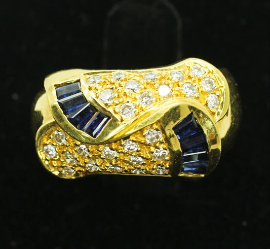 18k Yellow Gold Egyptian Inspired Pave Diamond & Tapered Blue Sapphire Ring